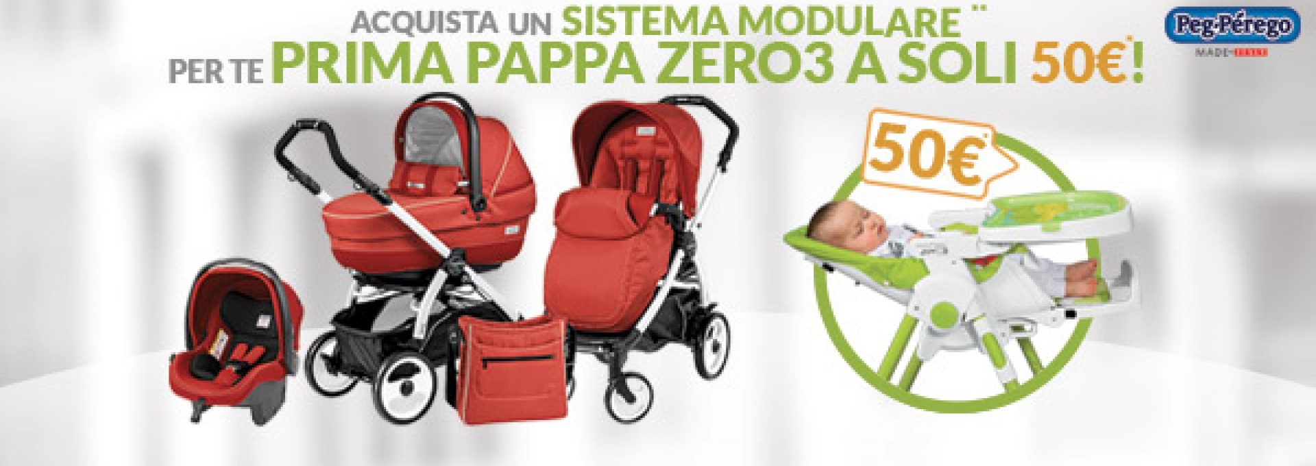 Dal 1 febbraio al 30 aprile, acquistando un Sistema Modulare Peg Perego della collezione 2016 (esclusa la vendita on line), avrai il seggiolone Prima Pappa Zero3 con seduta in PVC a soli 50 euro oppure il seggiolone Prima Pappa Zero3 con seduta in ecopelle a soli 60 euro.
